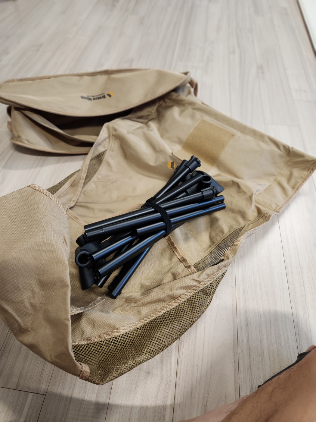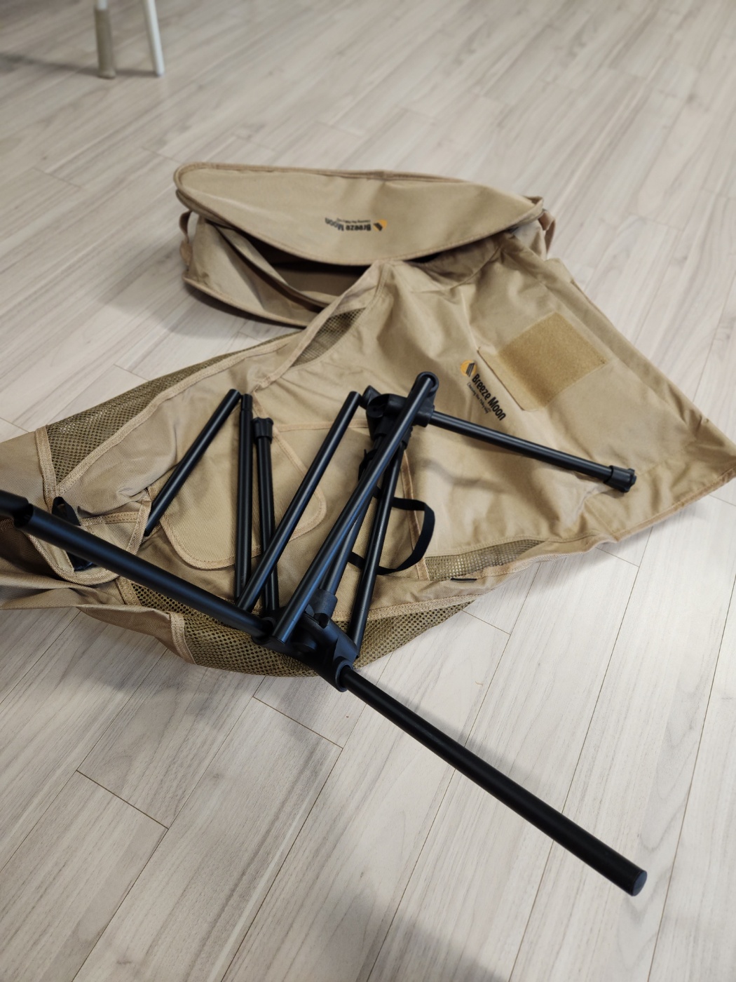 가방을 열어 구성품을 확인했을때는... 텐트폴대를 연상시키는 프레임과 엉덩이를 받혀줄 천 끝. (추가로 볼캡 개꿀)